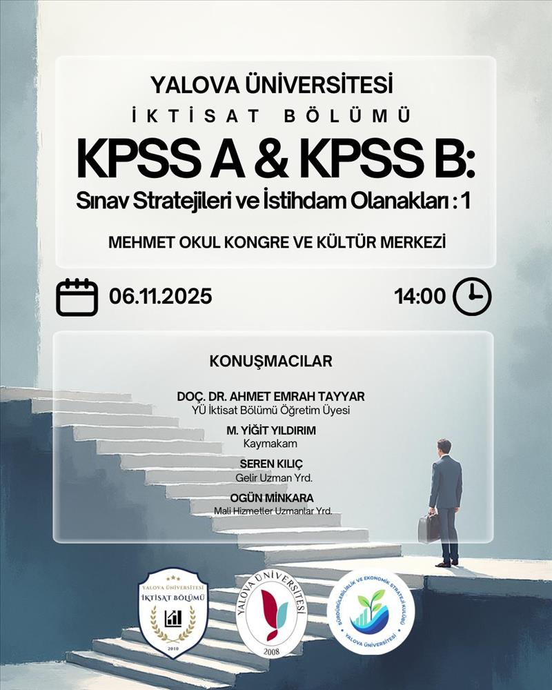 Yalova Üniversitesi İktisat Bölümü tarafından, öğrencilerimizin kamu personeli seçme süreci hakkında bilinçlenmesi ve kariyer planlamalarına katkı sağlanması amacıyla “KPSS A & KPSS B: Sınav Stratejileri ve İstihdam Olanakları - 1” başlıklı bir etkinlik düzenlenecektir.